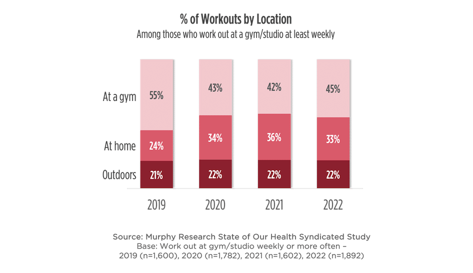 Consumers have a lot more options today than they did in 2019. They created home workout spaces and routines, discovered apps and equipment that allow them to break a sweat wherever, and joined organized sports leagues in large numbers. Gym members have also embraced new workout locations. The result is significantly more gym members exercising at community fitness centers, sports facilities, and school/university facilities.