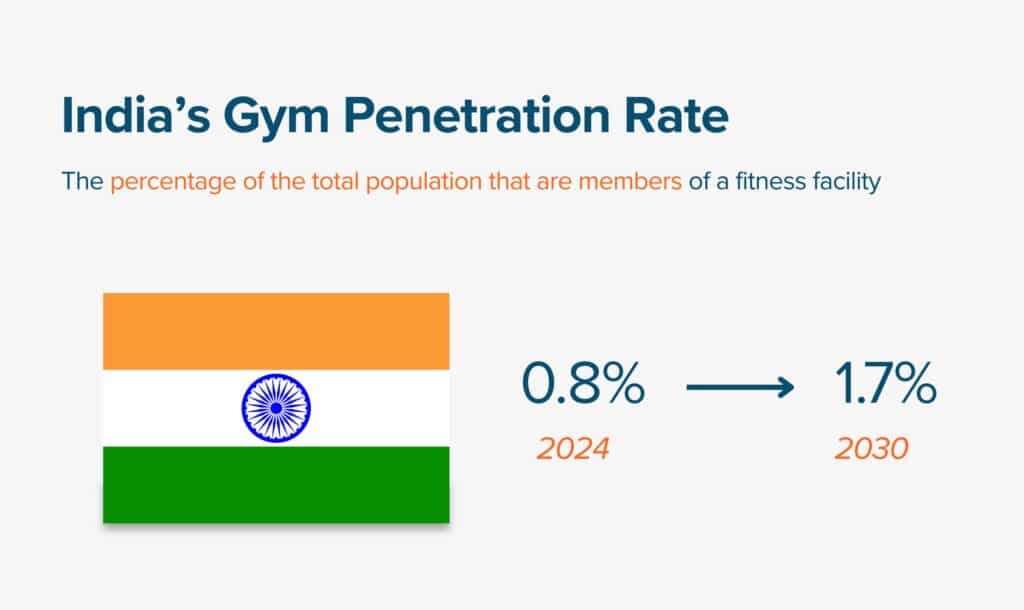India currently counts about 12.3 million fitness facility members, but with membership penetration at just 0.8% of the adult population, the market remains largely untapped. By 2030, memberships are projected to rise to 23.3 million, lifting penetration above 1.7%.